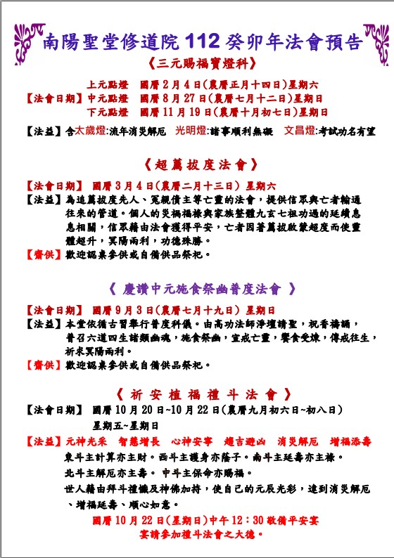 111_10_30 南陽聖堂修道院 112 癸卯年法會預告