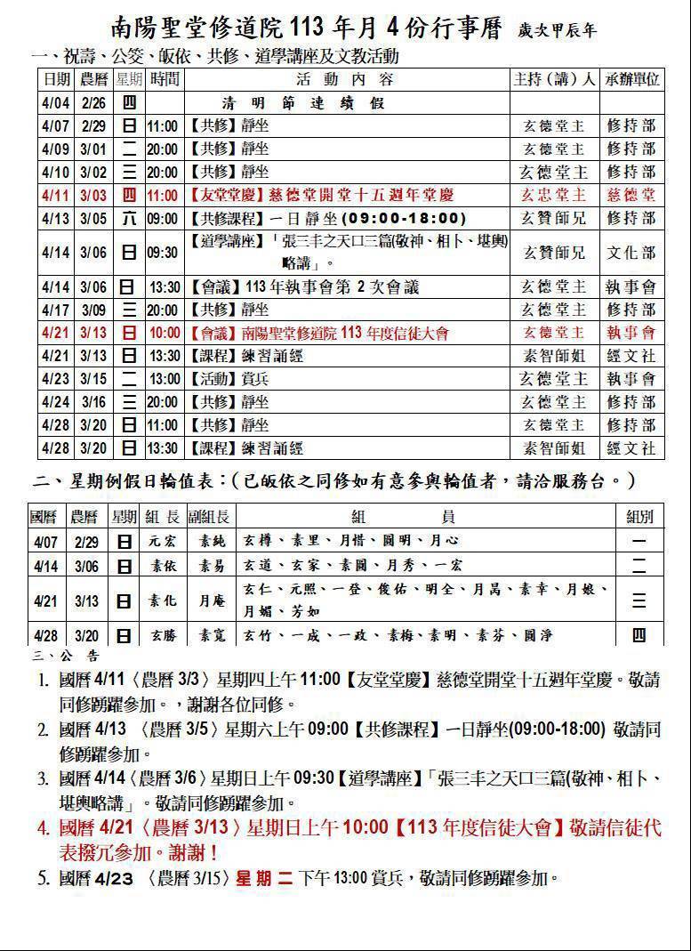 113.4 南陽聖堂113年4月行事曆