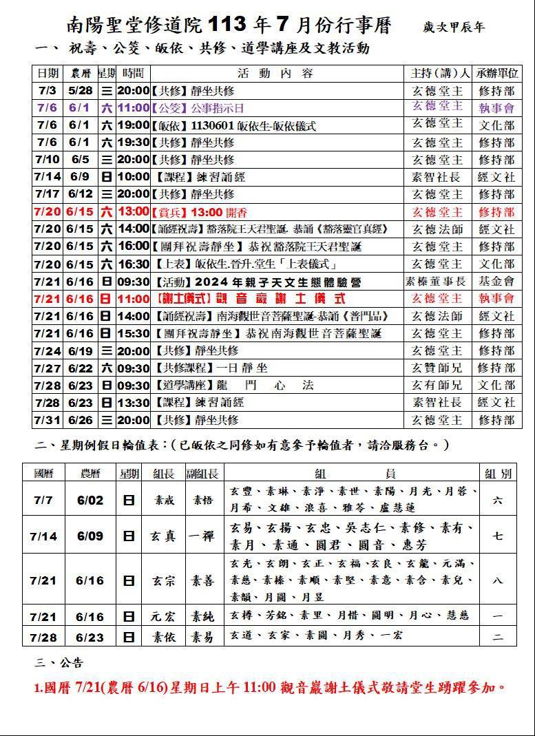 113.7 南陽聖堂113年7月行事曆