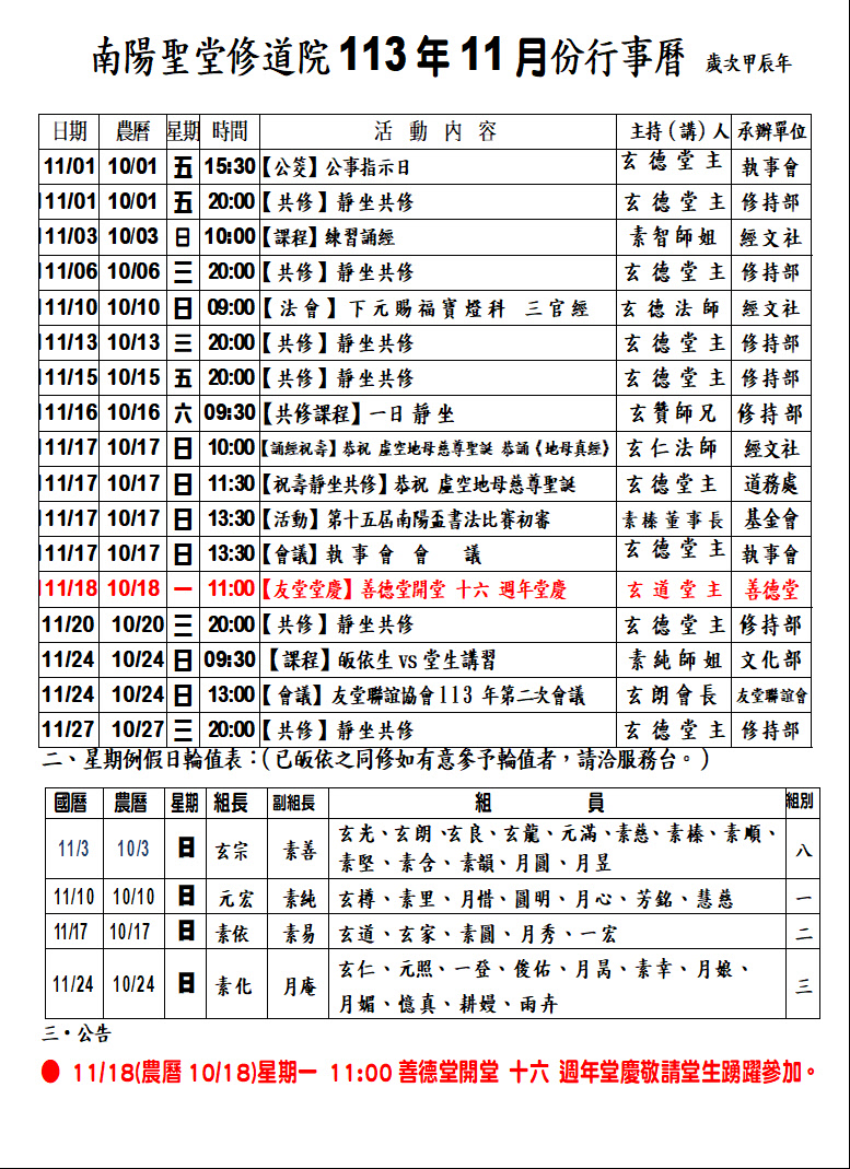 113.11 南陽聖堂113年11月行事曆