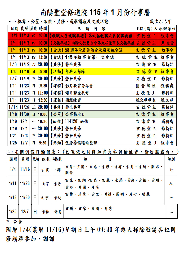 115.1南陽聖堂115年1月行事曆
