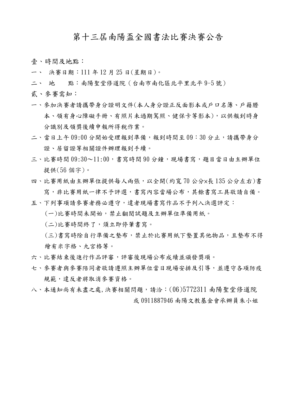 111_11_21 第十三屆南陽盃全國書法比賽_決賽名單暨