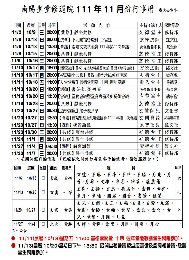 111.11.11南陽聖堂111年11月行事曆